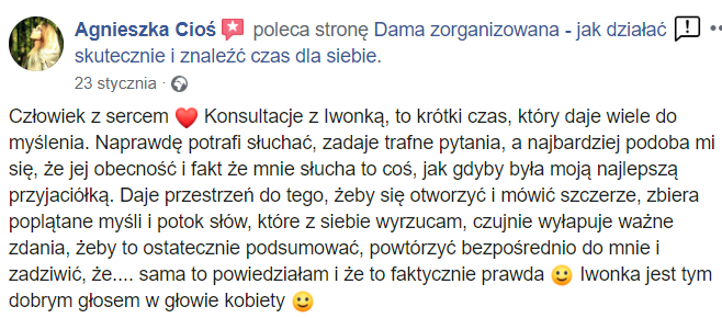 Po zakończeniu spotkań mam więcej energii, czuję się spełniona, lepiej wyglądam i czuję się ze sobą dobrze. To było moim celem i osiągnęłam go dzięki Pani Iwonie, która jest wybitnym słuchaczem, nie ocenia i motywuje do działania.