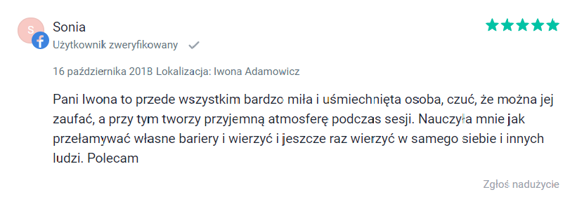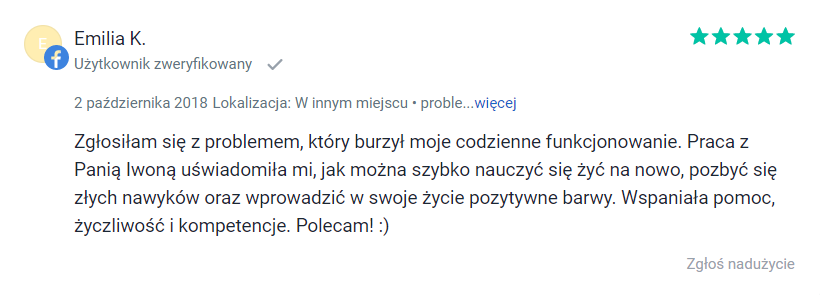 Jeśli zależy Ci na znalezieniu rozwiązań i osiągnięciu swoich celów zarówno prywatnych jak i zawodowych, a nie rozpamiętywaniu przeszłości to szczerze polecam Iwonę Adamowicz!