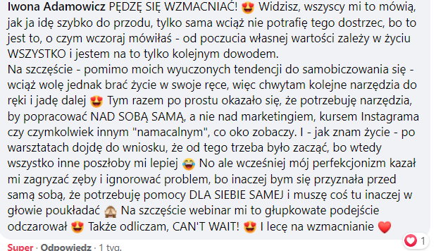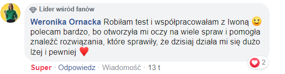 Sesje coachingowe pomogły mi zwiększyć swoją pewność siebie. Zauważyć swoje mocne strony oraz swoją wyjątkowość. Iwonę uważam, za sympatyczną, ciepłą i przede wszystkim profesjonalną coach!